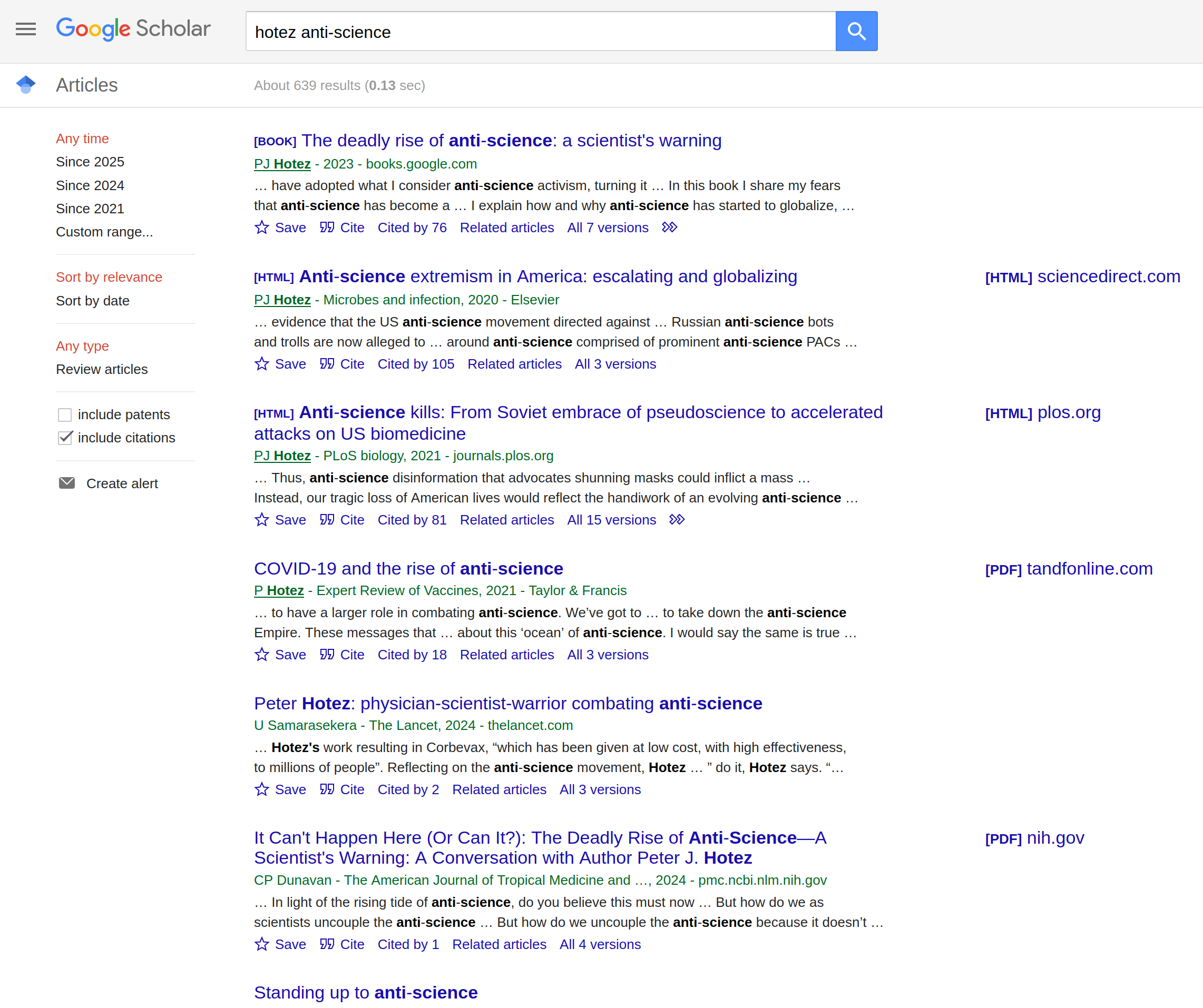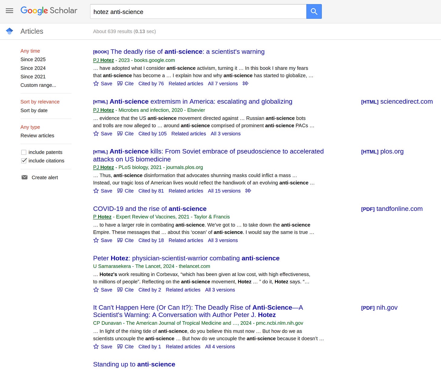 Many interviews with him can be found in which he claims, or at least displays the attitude, to have the moral high ground. Dr. Hotez seems to have divided the world up into two classes of people: on the one hand, those who stand with “science,” of which he portrays himself as one of the high priests. On the other side of the aisle are the moral deplorables who believe in “antiscience.” Dr. Hotez has written quite a few entries in academic journals to this tone, some of which are listed below. En passant, we note that most of those pieces have appeared in editorial or opinion sections of academic journals and are not peer-reviewed.