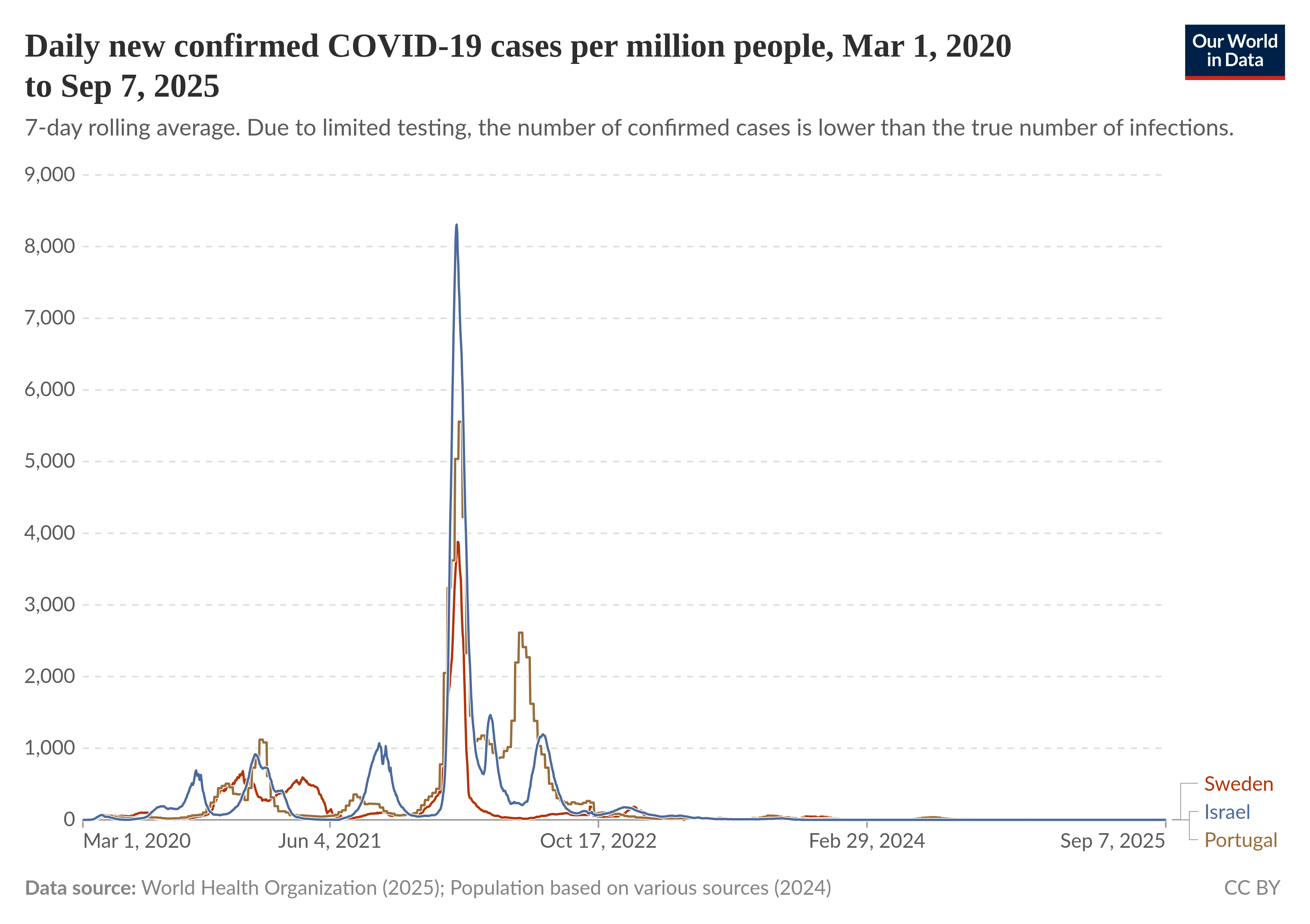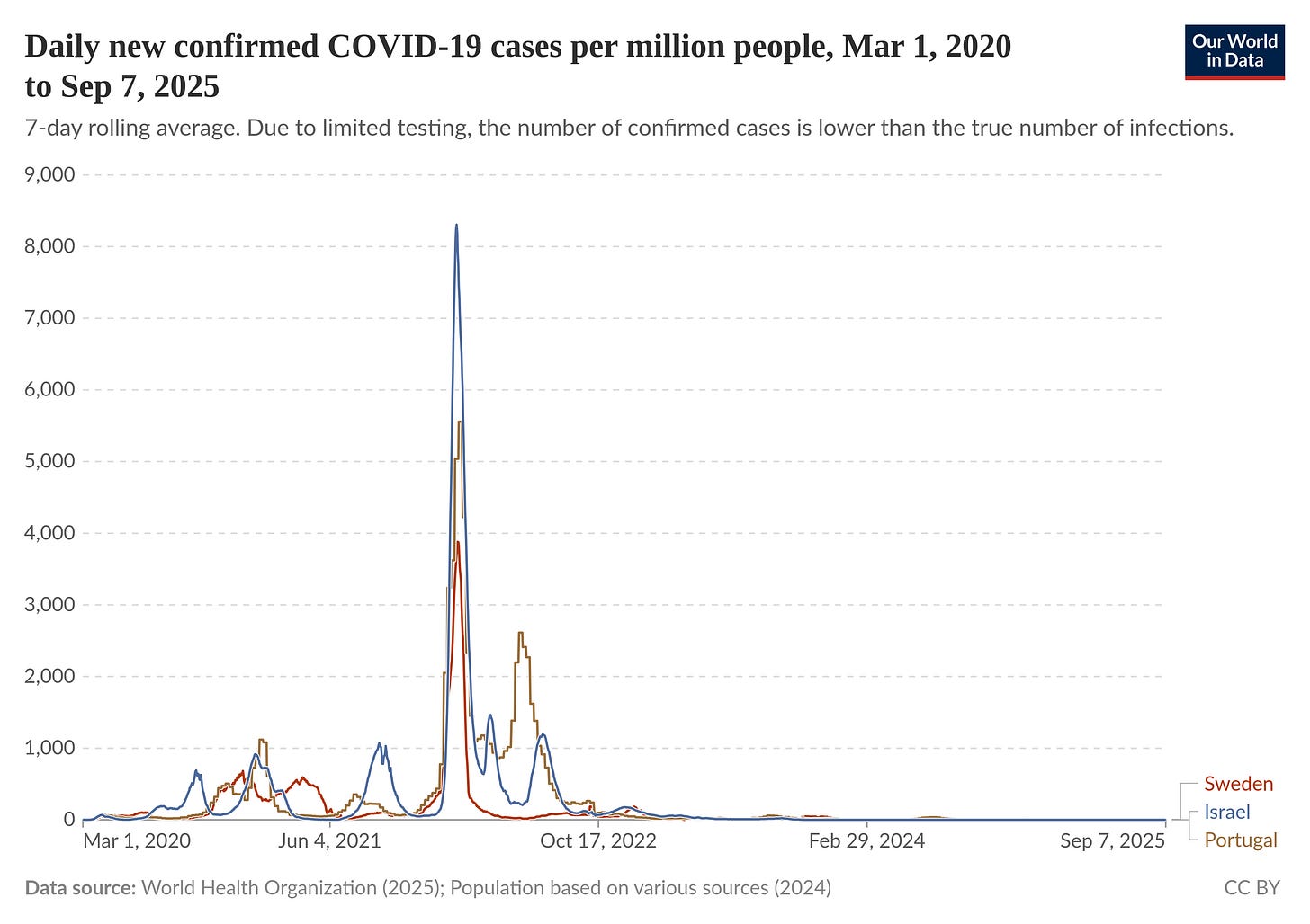 Antisemitism by itself is a very vile sentiment, so those who liken other attitudes to it better make sure that they end up on the right side of history. Given the historical context of the publication of these papers by Dr. Hotez, let’s look at what happened during the COVID-19 pandemic. It is true that Israel was the first country to roll out a mass vaccination campaign against COVID-19, which started on December 19, 2020. It also rolled out coercive measures like a “green pass” which only permitted the vaccinated to enter certain venues. Not surprisingly, roughly two thirds of all adults were vaccinated by mid-2021. However, were no more COVID-19 cases recorded after mid-2021? A chart from Our World in Data does not lie: in fact, by far the biggest peak of infections followed approximately a year after vaccination began. If the pandemic was really “ended by vaccine” as some claim, should we not have observed a clearly noticeable decrease in cases throughout 2021?