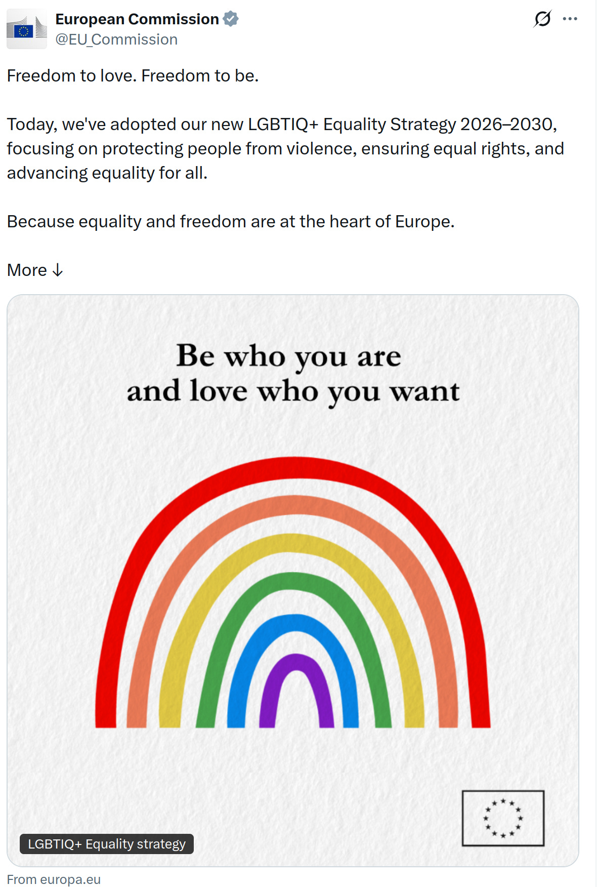 While the above will not happen today, it soon may. The European Commission has recently launched its “LGBTQI+ Equality Strategy 2026-2030.” To anyone not familiar with the European Commission’s internal workings, well, it operates in an eerily similar way to the Communist parties in China, North Korea, or in the former Soviet Union. Besides being composed of unelected officials, it also issues five-year plans on a wide range of topics, the only difference to communist parties being that the five-year plans are referred to as “strategies.” Strategies are non-binding documents by themselves, but over the course of the specified timeline, the European Commission will investigate how the topics mentioned in them can best be codified: through directives, ordinances, or recommendations. In spite of it consisting of unelected officials, its directives, as we have recently discussed, become a legal requirement to be implemented by member states’ legislatures. This mechanism, therefore, de facto nullifies democracy in member states, since we have recently witnessed many examples of member states being pressured, or even fined, by the European Commission for not implementing one or another of its directives, or even for not implementing it fast enough. A strategy document thusly is a canary in the coal mine: it looks ahead into which laws the European Commission will most likely codify and ergo, its non-binding status should not be seen as a reason to dismiss it. So what is exactly in the European commission’s alphabet-soup-and-arithmetic-operator-strategy?